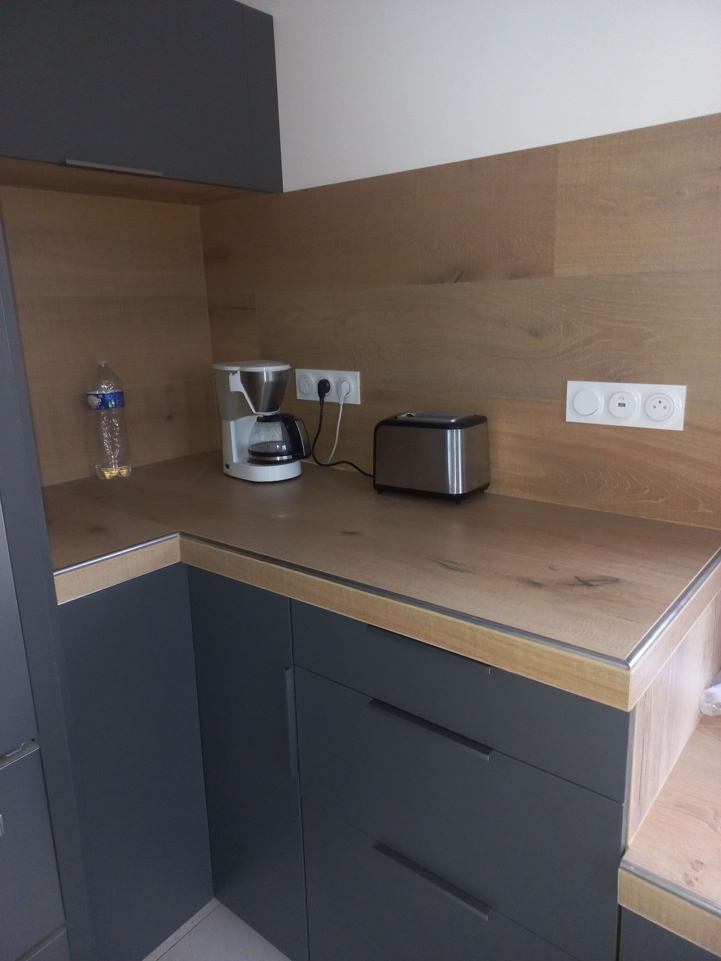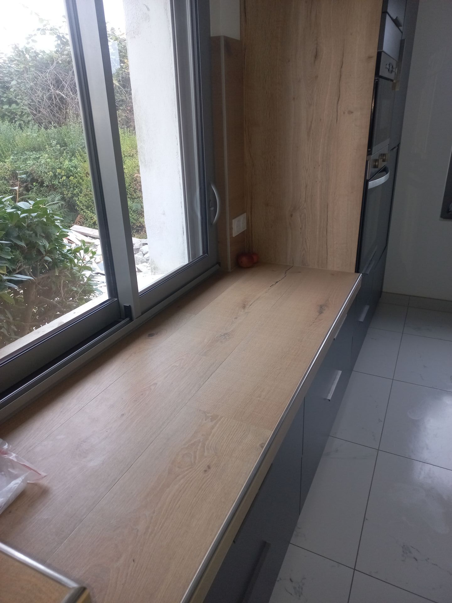 Réalisation d'un plan de travail de cuisine et pose carrelage effet bois avec baguette inox